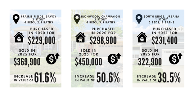 The homes in the graphic below bring this story to life. None of these properties had major renovations, yet each seller walked away with impressive gains—ranging from nearly 40% to over 60%—thanks to the timing of the market and steady local appreciation. When you hire the right team to guide you, you don’t just get a sign in the yard, you get trusted advisors who understand how to position your home for success, maximize your equity, and help you make the most of Champaign County’s market opportunities.